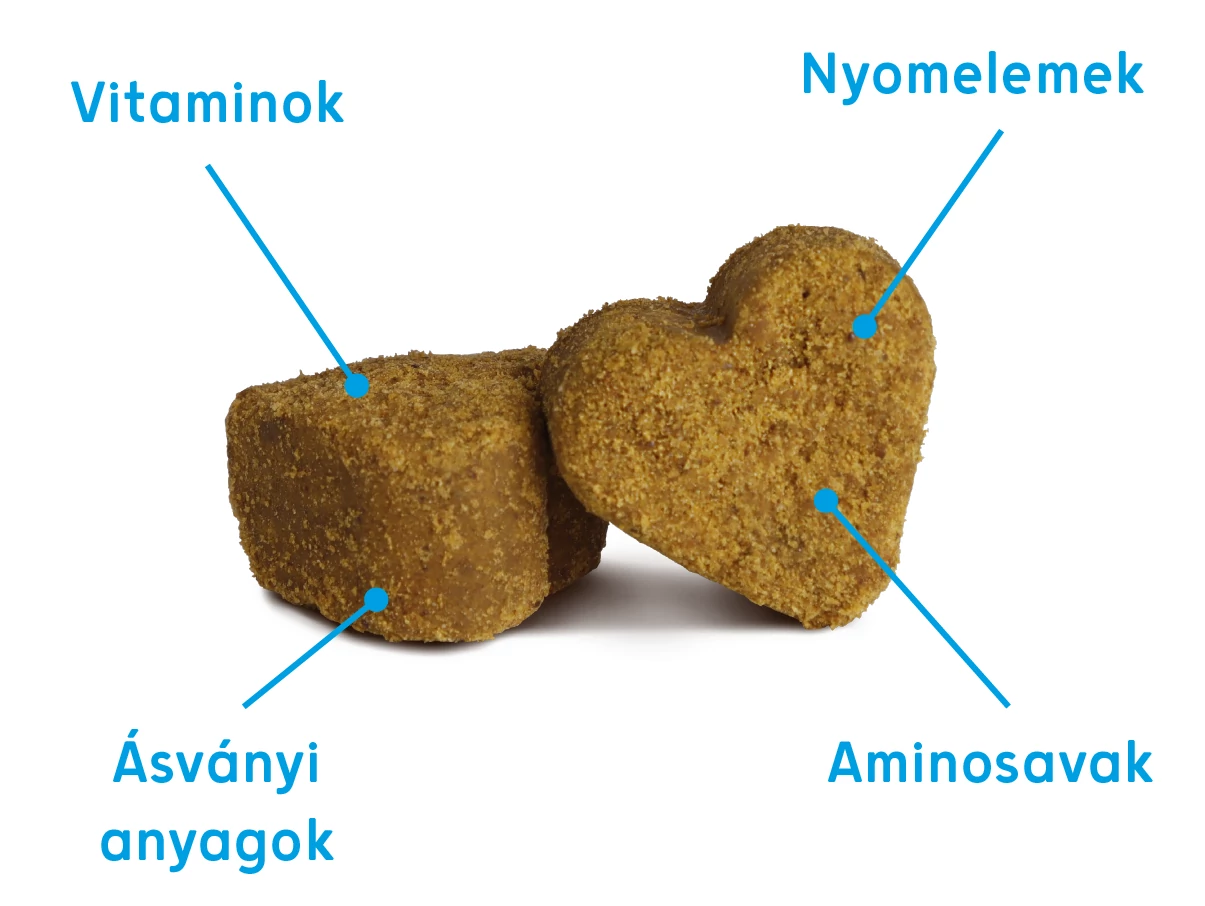 Vitaminok, ásványi anyagok, nyomelemek és aminosavak kiegyensúlyozott kombinációja az aktív immunrendszer, a hatékony anyagcsere és a stabil általános állapot szolgálatába állítva. 8 hetes kortól alkalmazható. Finom jutalomfalatként könnyen, közvetlenül megetethető, könnyen szétrágható, szétmorzsolható, eledelre szórható vagy eledelbe keverhető.